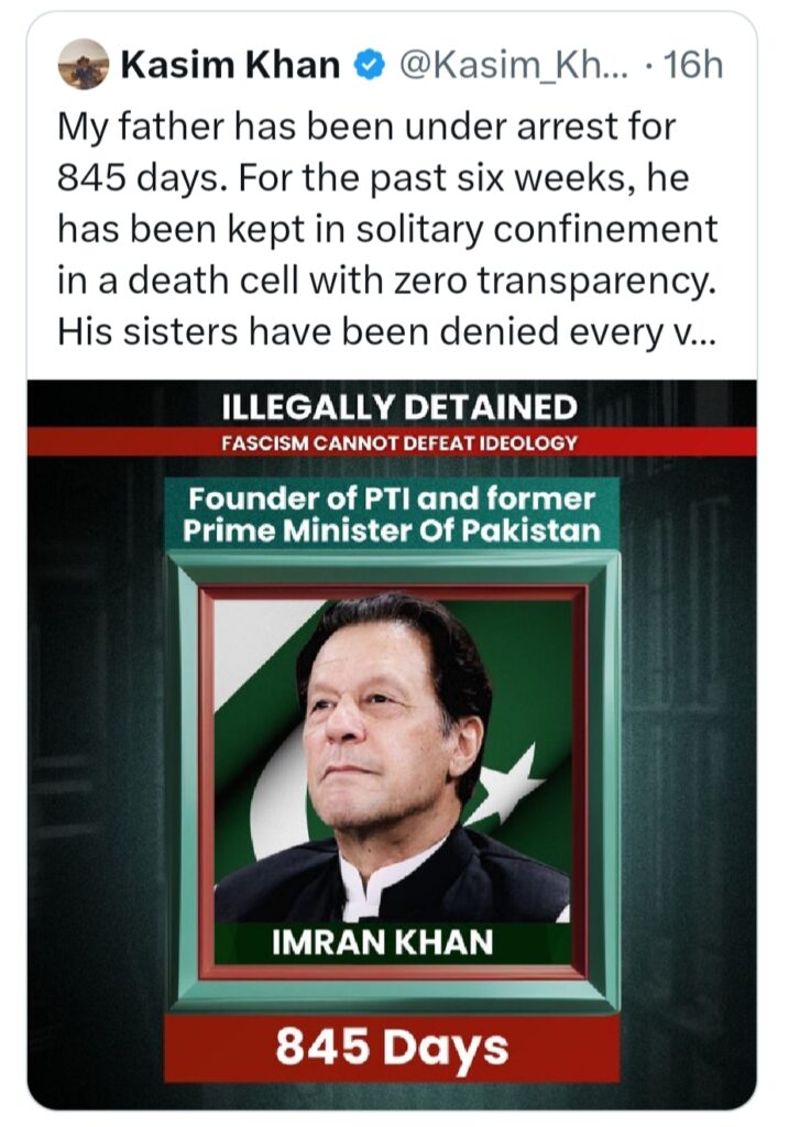 कासिम खान ने लिखा कि उनके पिता को 9 अगस्त 2023 को गिरफ्तार किया गया था यानी आज ठीक 845 दिन हो चुके हैं। पिछले छह हफ्तों से इमरान खान को रावलपिंडी की अडियाला जेल में एक छोटी सी “डेथ सेल” में पूरी तरह एकांत कारावास (सॉलिटरी कन्फाइनमेंट) में रखा गया है। इस दौरान न तो वकीलों को उनसे मिलने दिया गया, न परिवार के सदस्यों को और न ही पार्टी के किसी नेता को। कासिम के मुताबिक, “हमें नहीं पता कि वो जिंदा भी हैं या नहीं। यह कोई सुरक्षा प्रोटोकॉल नहीं, बल्कि सुनियोजित सजा है।”