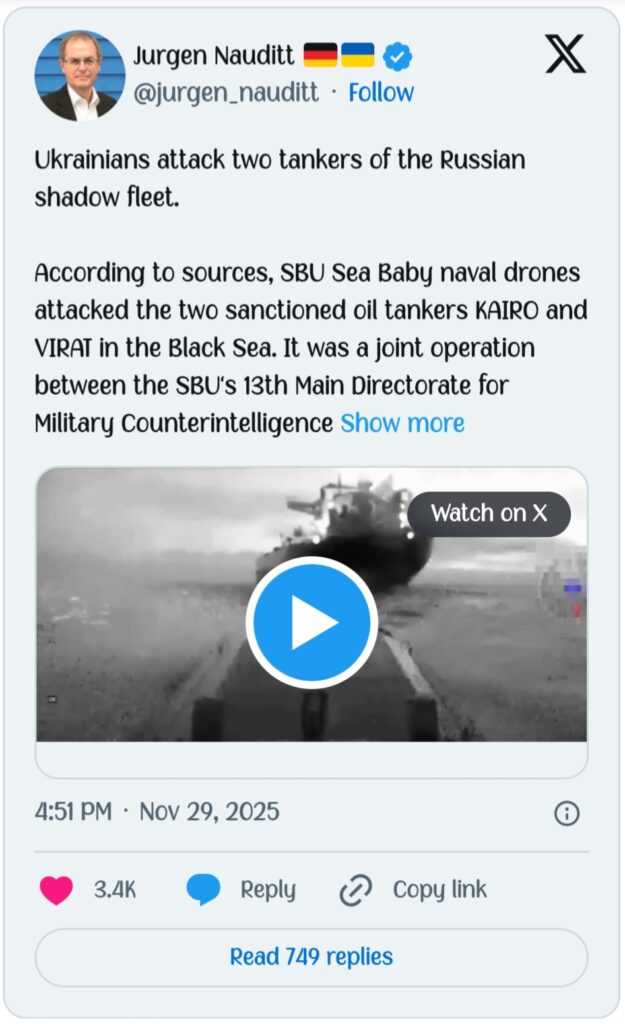 यूक्रेन की खुफिया एजेंसी SBU ने शनिवार को खुलासा किया कि उसने ब्लैक सी में रूस के दो छिपे हुए तेल टैंकरों को पानी के नीचे और सतह पर चलने वाले खतरनाक ड्रोनों से निशाना बनाया है। ये दोनों जहाज़ रूस की उस गुप्त बेड़े का हिस्सा थे जो पश्चिमी प्रतिबंधों को चकमा देकर दुनिया भर में रूसी कच्चा तेल पहुंचाते हैं।पहला हमला “विराट” नामक जहाज पर हुआ जो गाम्बिया का झंडा लगाए था।