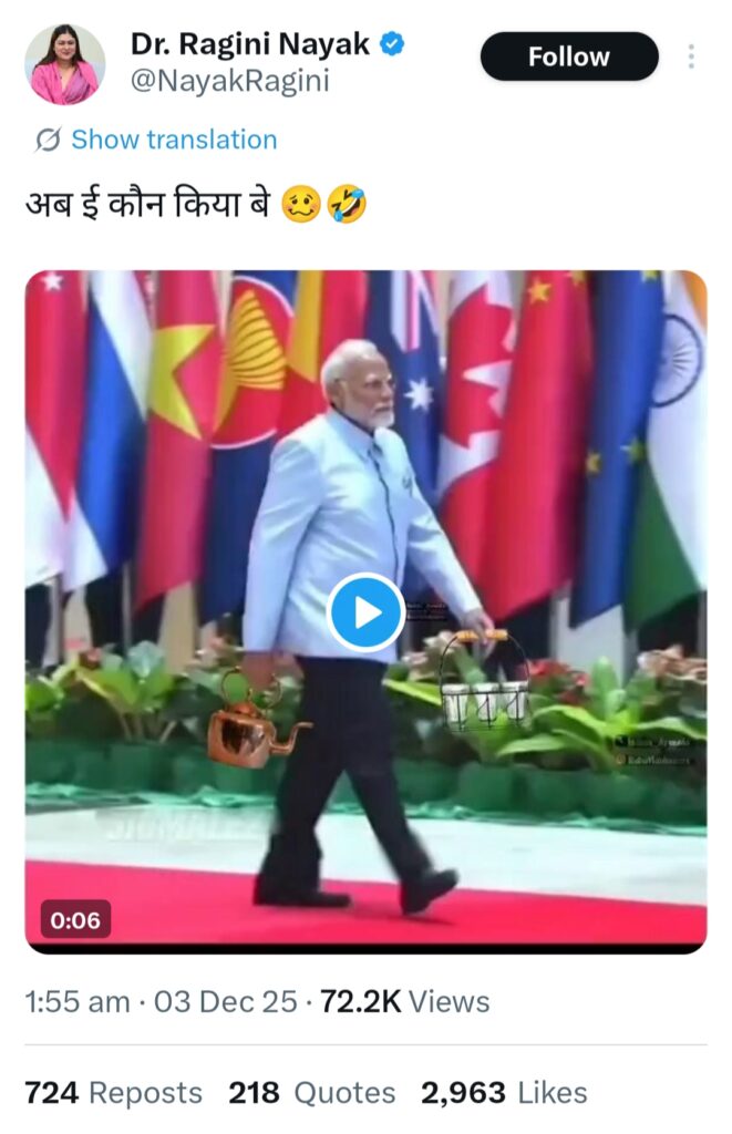 वीडियो में पृष्ठभूमि में भारत के साथ-साथ कई विदेशी झंडे और भाजपा का कमल चिह्न भी लगा हुआ है, जिससे यह संदेश देने की कोशिश की गई लगती है कि विदेशी दौरों के बीच भी प्रधानमंत्री का “असली काम” चाय बेचना ही है। यह व्यंग्य सीधे तौर पर 2014 के उस प्रसिद्ध “चायवाला” कैंपेन को उल्टा घुमाने की कोशिश दिखता है, जिसने मोदी को जन-जन तक पहुंचाया था।
