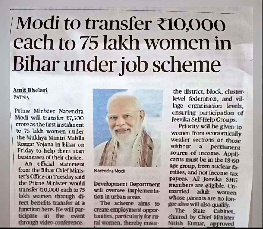 मुख्यमंत्री महिला रोजगार योजना नीतीश कुमार सरकार की महत्वाकांक्षी पहल है, जिसका उद्देश्य महिलाओं को छोटा कारोबार शुरू करने के लिए सीड मनी देना है। यह अनुदान है, यानी महिलाओं को इसे वापस नहीं करना पड़ता। सफल कारोबार पर आगे 2 लाख रुपये तक की अतिरिक्त मदद का प्रावधान है। चुनाव से पहले इस योजना को एनडीए का ‘गेम चेंजर’ बताया गया, जिसने महिलाओं का वोट मजबूत किया।