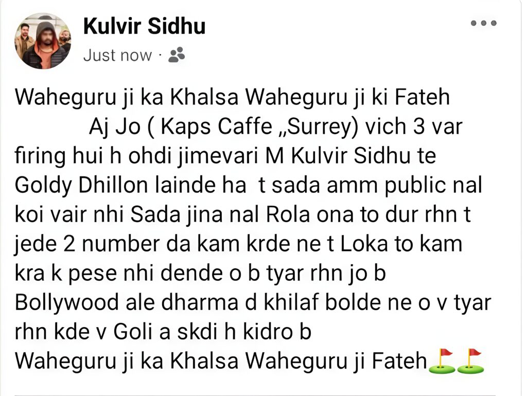 “वाहेगुरु जी का खालसा, वाहेगुरु जी की फतेह। > आज Kaps Caffe में तीन बार फायरिंग हुई है, उसकी जिम्मेदारी मैं कुलवीर सिद्धू और गोल्डी ढिल्लों लेते हैं। आम जनता से कोई दुश्मनी नहीं। जिनसे हमारा झगड़ा है वो दूर रहें। दो नंबर का काम करने वाले और बॉलीवुड में धर्म के खिलाफ बोलने वाले तैयार रहें। गोली कहीं से भी आ सकती है।”